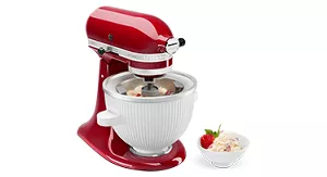 KitchenAid Ice Cream Maker Attachment produces up to 1.9 L of soft consistency ice cream, sorbets or frozen desserts. Liquid within the double walls of this innovative freeze bowl provides thorough and even-freezing, throughout the mixing process.